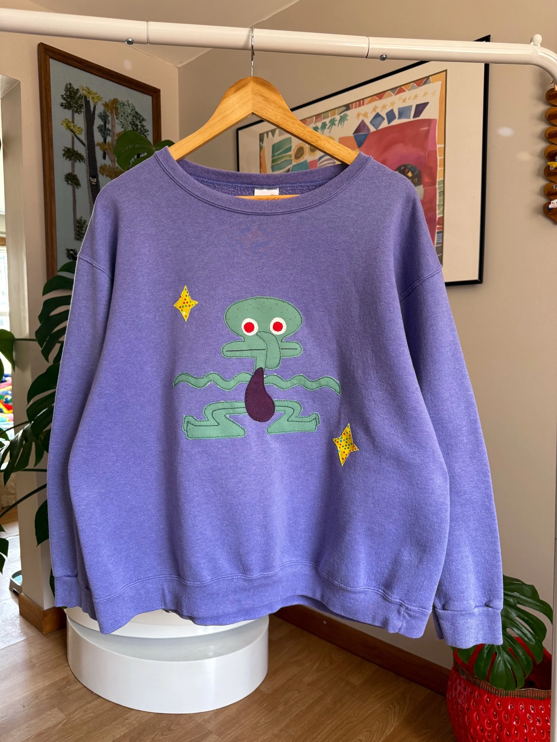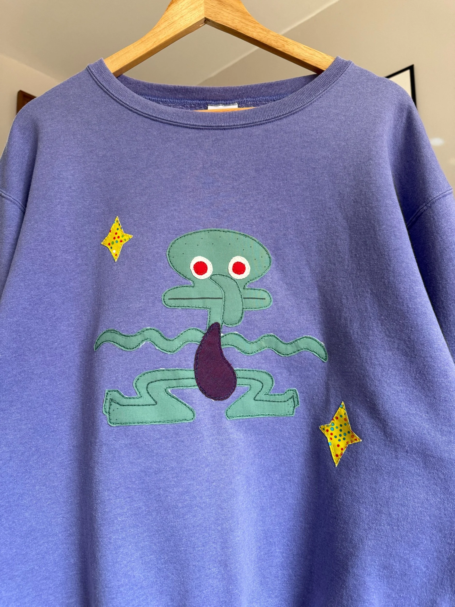 There are so many versions of squidward… but arguably one of the best is: DANCING SQUIDWARD!!!! This icon of a squid is sewn onto a sweatshirt, brand “Hanes”